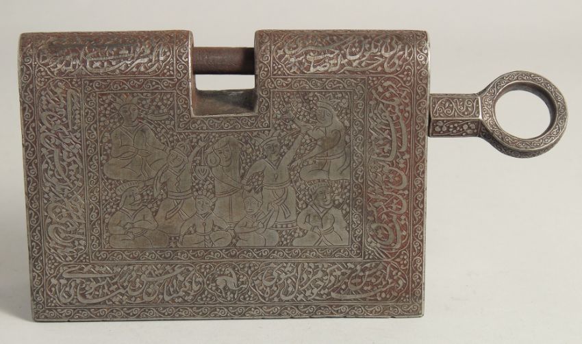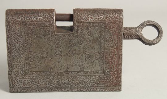 A LARGE ISLAMIC ENGRAVED STEEL LOCK, with bands of calligraphy and spring-operated locking system, 28cm wide