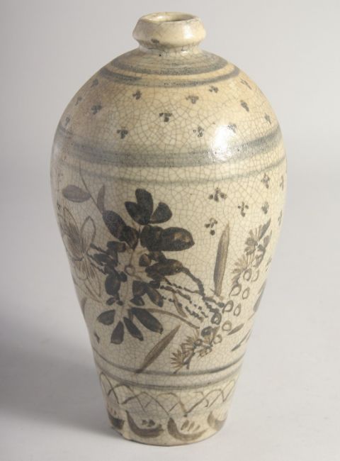 A CHINESE CRACKLE GLAZE MEIPING VASE, painted with flora and birds, 25cm high.