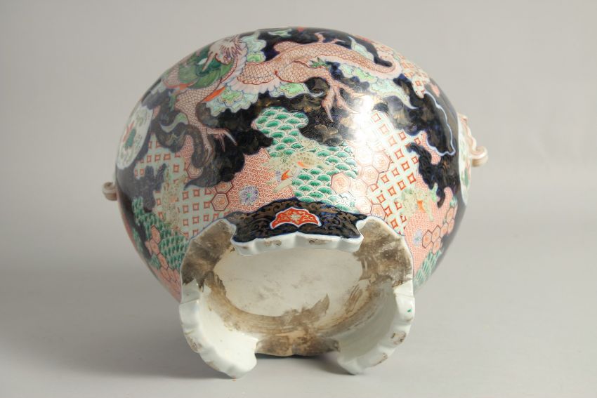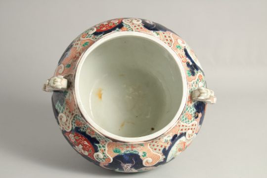 A VERY LARGE JAPANESE IMARI TWIN HANDLE KORO AND COVER, painted with a dragon as well as various panels depicting phoenix, lion dogs, figures, and flora, with dragon formed handles and moulded lion dog to the cover, 35cm high.