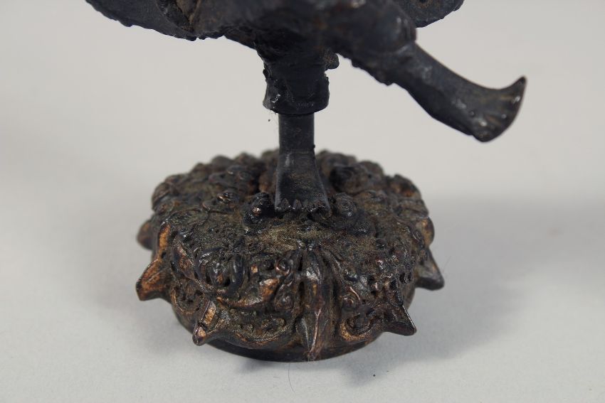 A CHINESE BRONZE FIGURE OF A DANCING MAN, mounted to a lotus-formed base, possibly Ming. 15cm high.