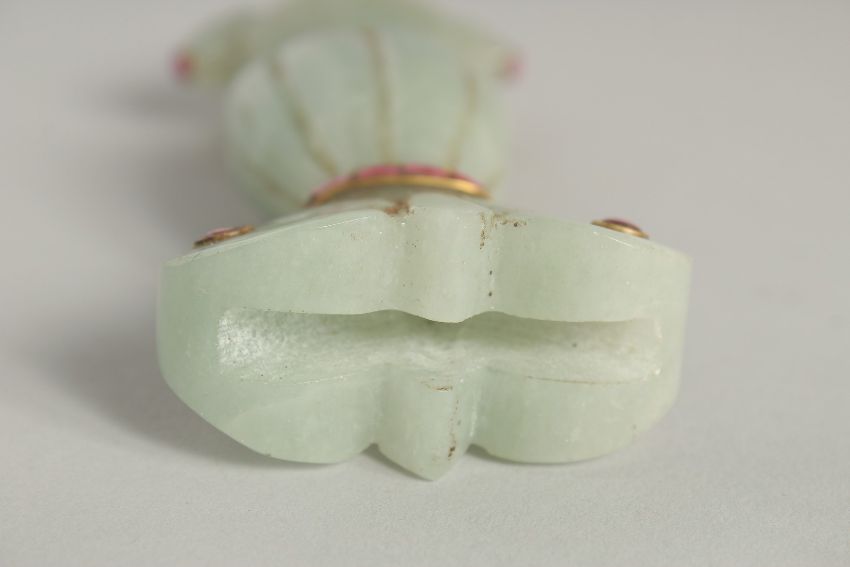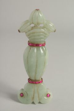 A MUGHAL STYLE CARVED JADE DAGGER HANDLE, onlaid with semi-precious stones, 13.5cm long.