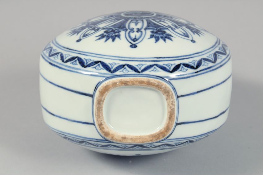 A CHINESE BLUE AND WHITE PORCELAIN MOON FLASK with twin handles and decorative yin-yang motif to body, bearing six-character mark below rim. 26.5cm high