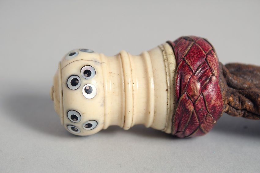 A RARE 18TH CENTURY TURKISH OTTOMAN LEATHER FLASK, with bone lid inlaid with cintamani designs, 23cm long.