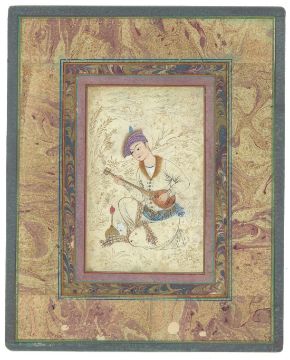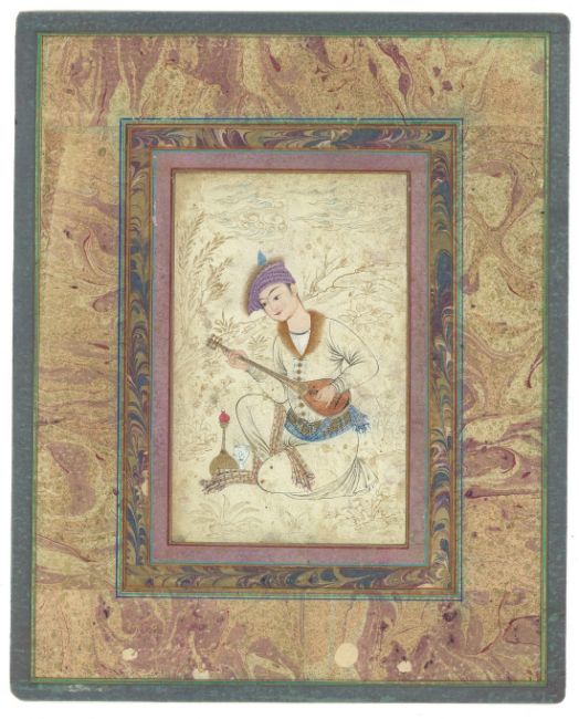 A PERSIAN MINIATURE PAINTING ON PAPER, depicting a seating figure playing a musical instrument with a marbled border and gilt highlights, image 16cm x 10.5cm.