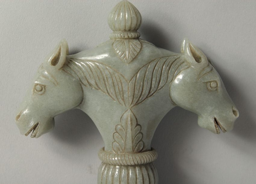 A LARGE MUGHAL STYLE CARVED JADE SWORD / DAGGER HANDLE, carved to one end with double-headed horse, the other with double-headed ram, 18.5cm long.