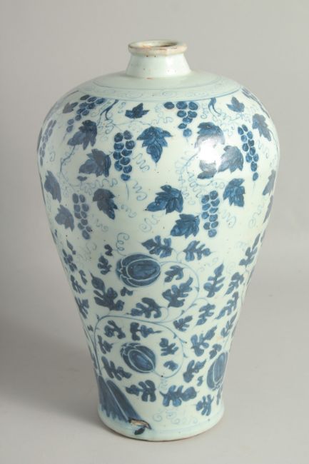 A LARGE CHINESE BLUE AND WHITE PORCELAIN MEIPING VASE painted with fruit and leaves. 41cm high