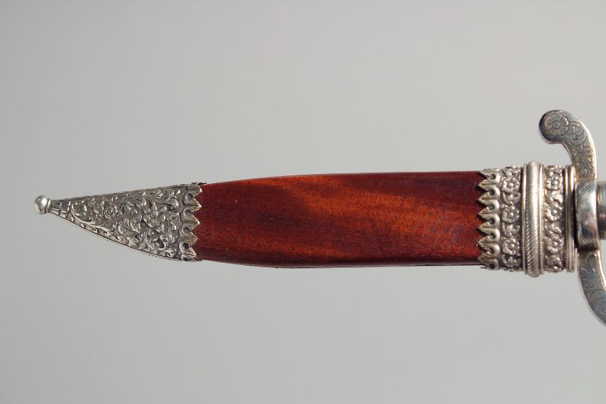 A RARE 19TH CENTURY NORTH INDIAN KUTCH SILVER MOUNTED EUROPEAN STYLE HUNTING DAGGER, with antler handle and wooden sheath, 33cm overall.