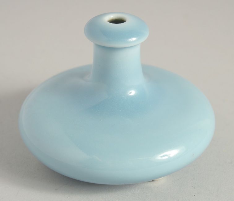 A SMALL CHINESE CLAIR-DE-LUNE POWDER BLUE GLAZE PORCELAIN VASE, on three moulded feet, with six-character mark, 8cm high.