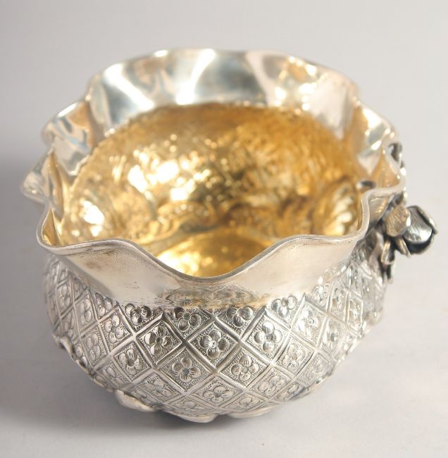 A TURKISH SILVER OVAL SHAPED BOWL, with moulded rim, repousse decoration and applied flower heads, stamped Melda special 900, 24.5cm long, 510g.