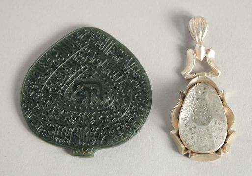 AN ISLAMIC ROCK CRYSTAL CALLIGRAPHIC DROP PENDANT, together with a carved jade calligraphic pendant, 6cm x 5.5cm, (2).