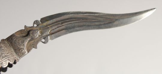 TWO 18TH CENTURY SOUTH INDIAN BICHWA DAGGERS, one with silver inlaid handle and clothed wooden sheath. Daggers 25cm and 24cm