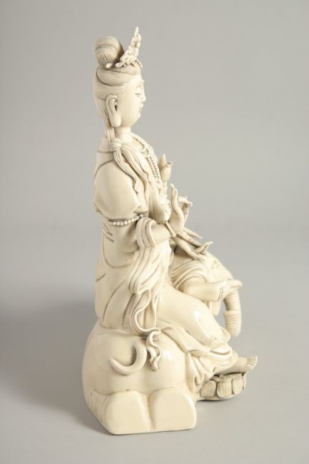 A DEHUA PORCELAIN GUANYIN FIGURE, seated upon an elephant, the reverse with impressed marks. 32cm high
