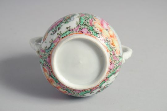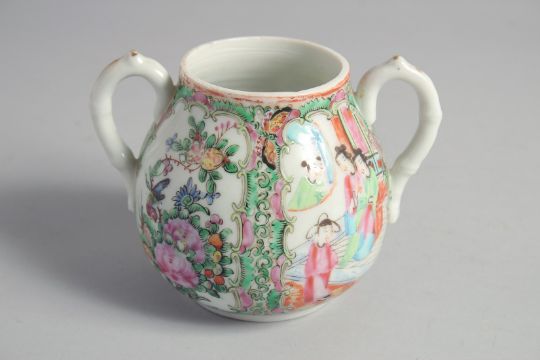 A COLLECTION OF FOUR CHINESE CANTON FAMILLE ROSE PORCELAIN PIECES, comprising a twin handle sugar bowl, a teacup (af), an egg cup (loss to rim), and an oval strainer, (4).