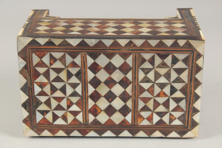 A GOOD 19TH CENTURY MOORISH MOTHER OF PEARL, TORTOISESHELL AND BONE INLAID MINIATURE TABLE, with opening drawer to the front, 23cm wide.