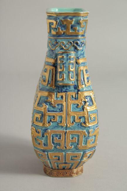 A CHINESE TURQUOISE GROUND GILDED TWIN HANDLE VASE, with blue and turquoise ground and raised archaic style decoration, the base with six-character mark, 17cm high.