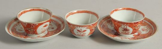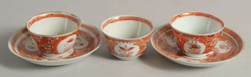 THREE CORAL RED AND WHITE PORCELAIN TEA BOWLS, together with two saucers, cups 6cm diameter, saucers 10.5cm diameter, (5).
