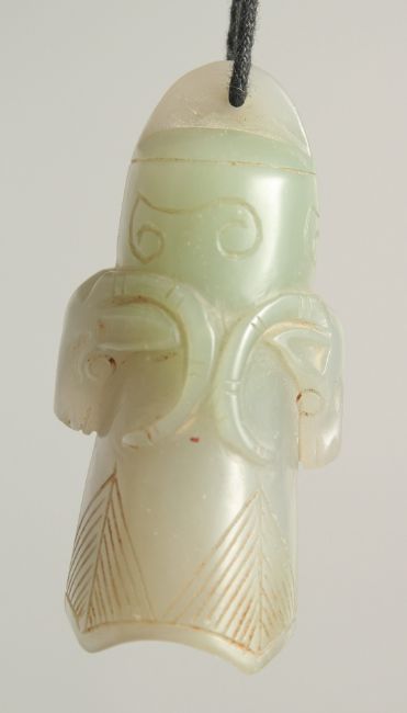 A CHINESE CARVED JADE PENDANT on string, jade 6cm.
