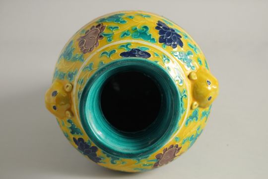 A CHINESE FAHUA PORCELAIN VASE with moulded twin handles and raised decoration depicting ducks and aquatic flora. 32cm high