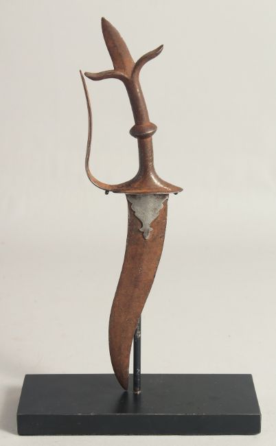 A SMALL INDIAN TULWAR DAGGER, with curving blade, together with stand, dagger 33cm long.