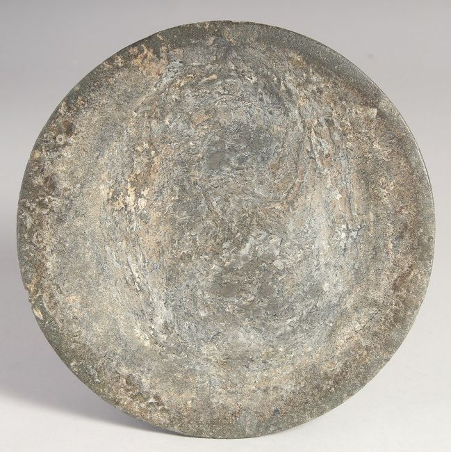 A LARGE 18TH CENTURY INDIAN BIDRI SILVER INLAID HUQQA BASE, with decorative floral panels. 20cm diameter