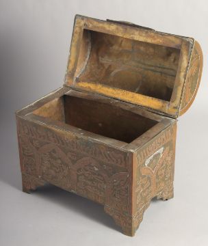 AN UNUSUAL FINE 19TH CENTURY MALAYSIAN CALLIGRAPHIC COPPER INLAID BRASS CASKET, with hinged lid, and raised on four bracket feet. 31cm wide
