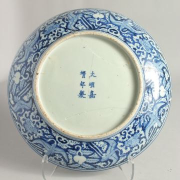 A LARGE CHINESE BLUE AND WHITE DISH, (af), 33cm diameter.
