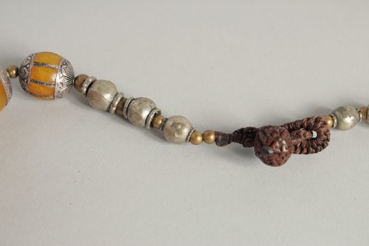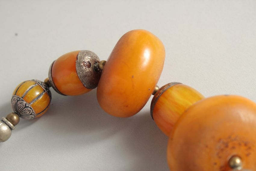 AN ETHNIC LARGE BEADED PRESSED AMBER NECKLACE, with different size beads and metal mounts, largest bead approx. 5cm wide.