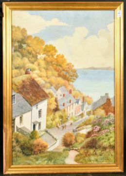 A. Blackshaw, Circa 1923, 'Clovelly' a hilltop view, watercolour, signed, 28.5" x 19" (72 x 48cm), along with a J. Howard view of a sailboat on a moorland lake, gouache, 6" x 10" (15 x 25cm), and 'The Pedlars Cart' a watercolour by Leyton Forbes, 9.5" x 19.5" (24 x 49.5cm), (3).
