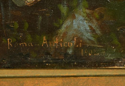 Italian School, circa 1902, a young woman standing at a hillside spring in Anticoli, inscribed Roma Anticoli and dated 1902, oil on canvas, 22.75" x 17" (58 x 43cm), in a fine Barbizon stye frame.