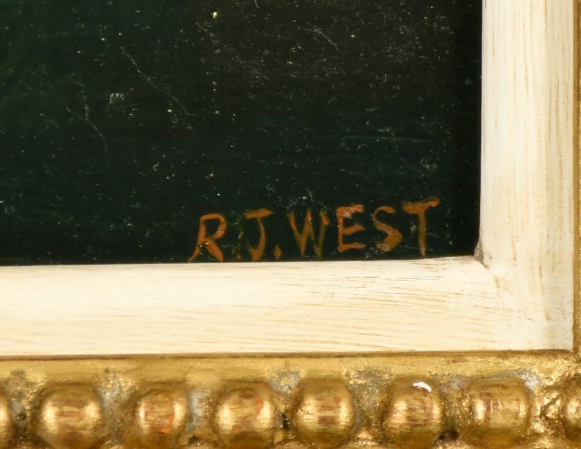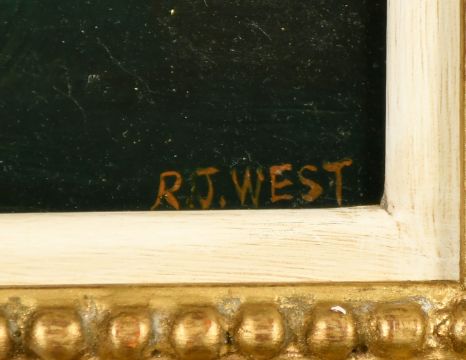 R.J. West (20th Century) A portrait of a gentleman seated at a table with a globe, ink pot and papers, oil on board 12" x 16", (30.5x40.5cm).