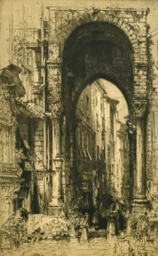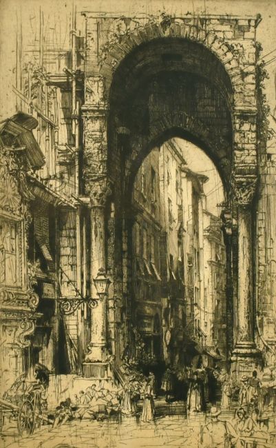 Hedley Fitton, 'The City gateway, Genoa', etching, signed in pencil, Inns & Blake trade label verso, 18" x 11.5", (46x29cm).
