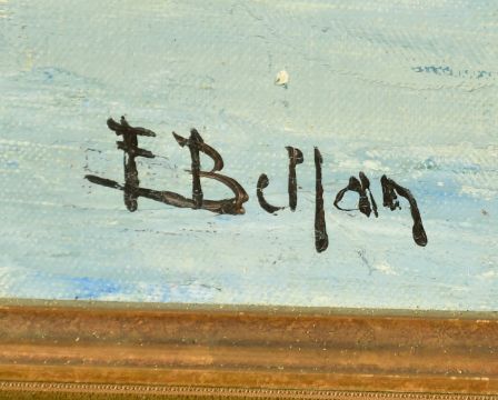 E. Bellan, fishing boats moored off a quay at Honfleur, oil on canvas, signed, 18" x 15" (46 x 38cm).
