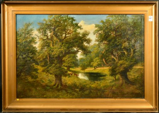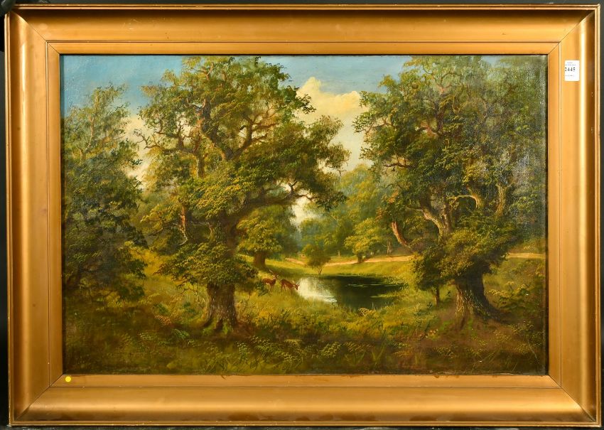 J. Lewis (19th Century) An extensive parkland setting with oak trees and deer by a pond, oil on canvas, signed, 20" x 30", (51x76cm).