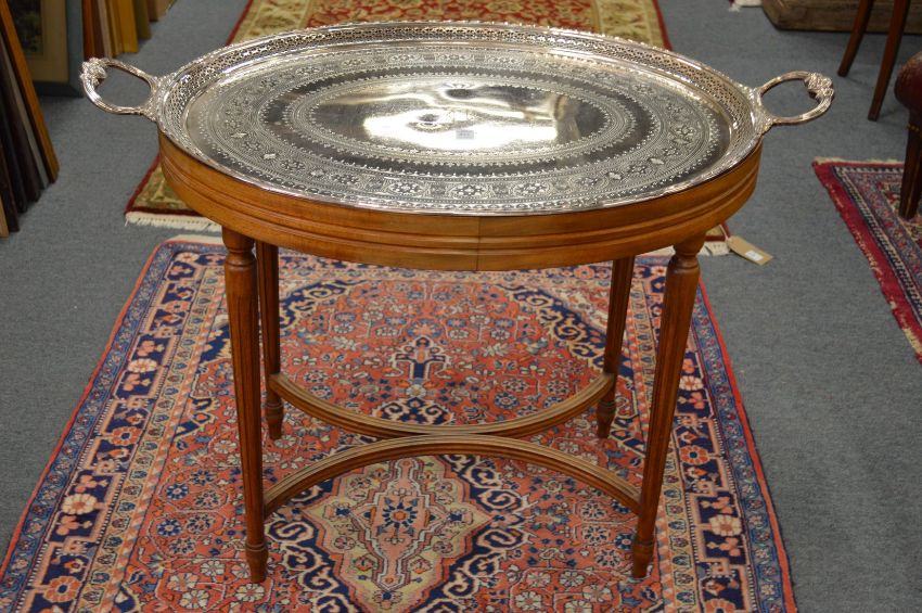 A good silver plated twin handled oval tray with engraved decoration on a mahogany stand.