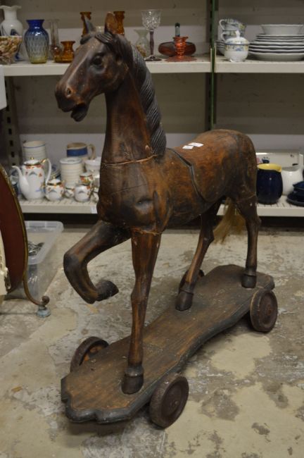 A large carved wooden horse on wheeled base.