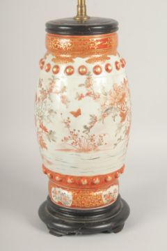 A JAPANESE KUTANI PORCELAIN VASE LAMP, the vase painted with flora and fine gilt highlights, with two bands of raised bosses and mounted to a hardwood base, 70.5cm high overall.