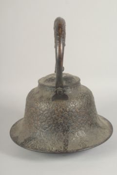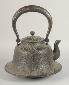 A LARGE 19TH CENTURY JAPANESE CAST IRON TETSUBIN / KETTLE, with relief flower head decoration all over, 36cm high (with handle up), 30cm diameter.