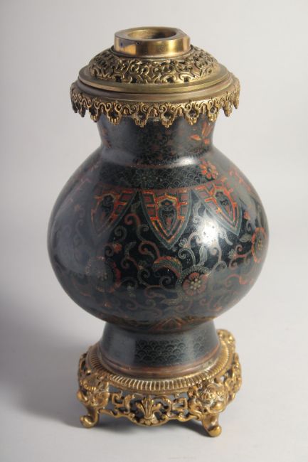 A JAPANESE BLACK GROUND CLOISONNE VASE / LAMP, with pierced metal mounts, decorated with flower head motifs and raised on a base with four tiger formed feet, 34cm high.