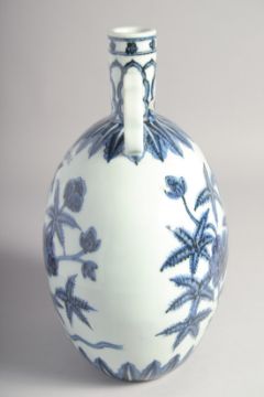 A CHINESE BLUE AND WHITE PORCELAIN TWIN HANDLE MOON FLASK, decorated with flora and bearing a six-character mark, 27.5cm high.