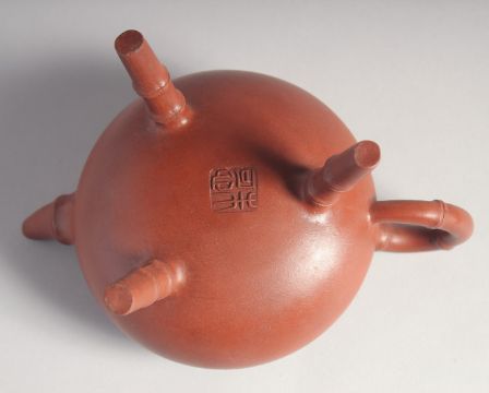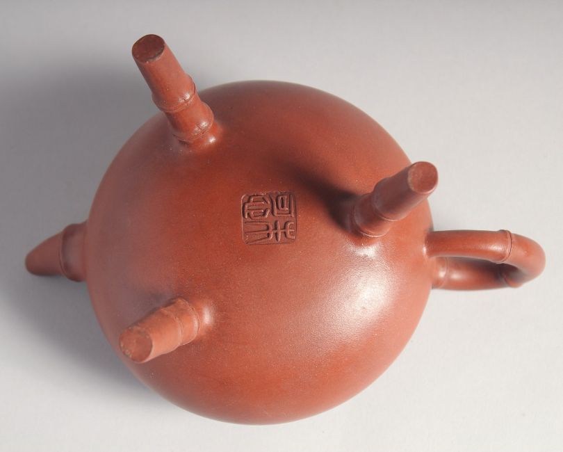 AN UNUSUAL CHINESE YIXING TRIPOD TEAPOT, with impressed marks to inner lid and base, 12cm high.