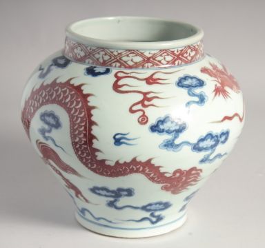 A CHINESE BLUE AND UNDERGLAZE RED PORCELAIN DRAGON JAR, 22cm high.