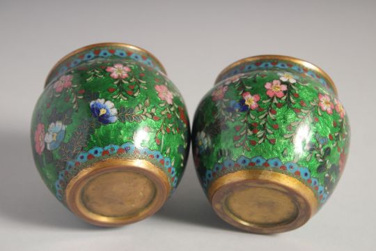 A GOOD PAIR OF GREEN GROUND ENAMELLED CLOISONNE JARS, decorated with flowers, 7.5cm high.