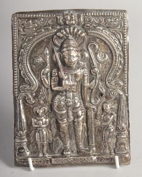 A 19TH CENTURY SOUTH INDIAN SILVER REPOUSSE PLAQUE OF SHIVA, Shiva depicted in the warrior form Virbhadra and attended by Daksa and Sati. 16.5cm x 12cm