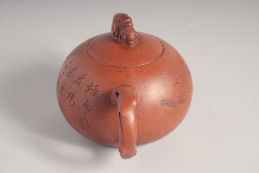 A CHINESE YIXING TEAPOT; signed by Gu Jing Zhou, 16cm spout to handle.