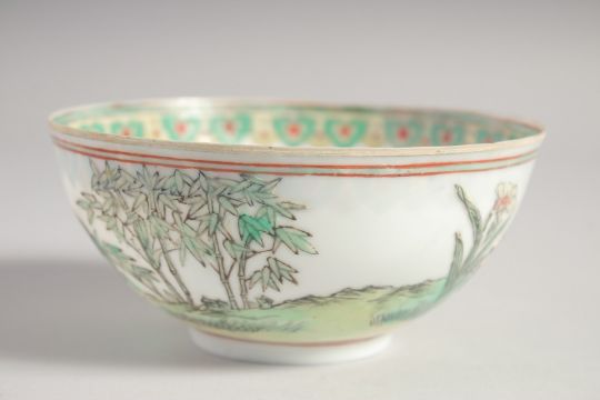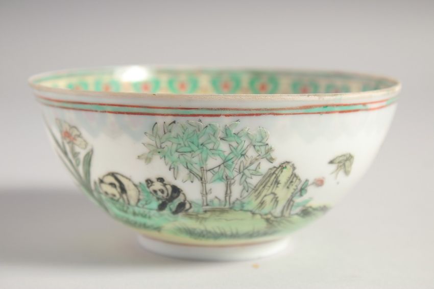 A CHINESE EGGSHELL PORCELAIN PANDA BOWL, the exterior painted with a continuous scene with pandas, butterflies and flora, four-character mark to base, 12cm diameter.