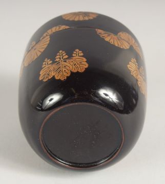 A JAPANESE LACQUER NATSUME / TEA CADDY, in Kodaiji style decorated with gold chrysanthemum crests, with draw-string sleeve, caddy 7.5cm high.
