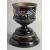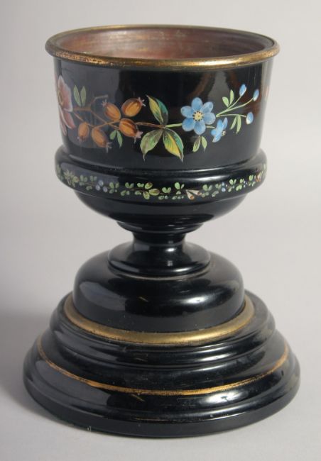 A VICTORIAN BLACK URN painted with flowers on a wooden stand.