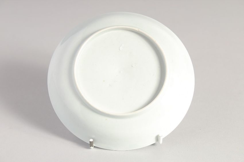 A LIVERPOOL CHAFFERS FACTORY TEABOWL AND SAUCER painted in blue with two men bowing.