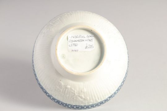 A LIVERPOOL BOWL with reeded decoration and moulded flowers and another BOWL painted with flowers in blue (2).