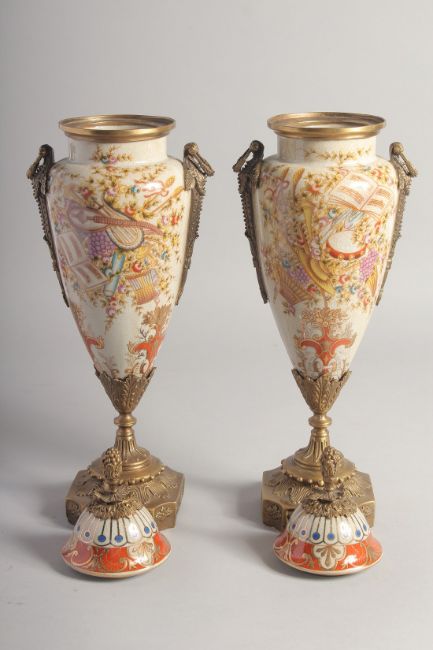 A PAIR OF TURQUOISE PORCELAIN AND BRONZE URN SHAPED VASES AND COVERS, decorated with musical trophies.